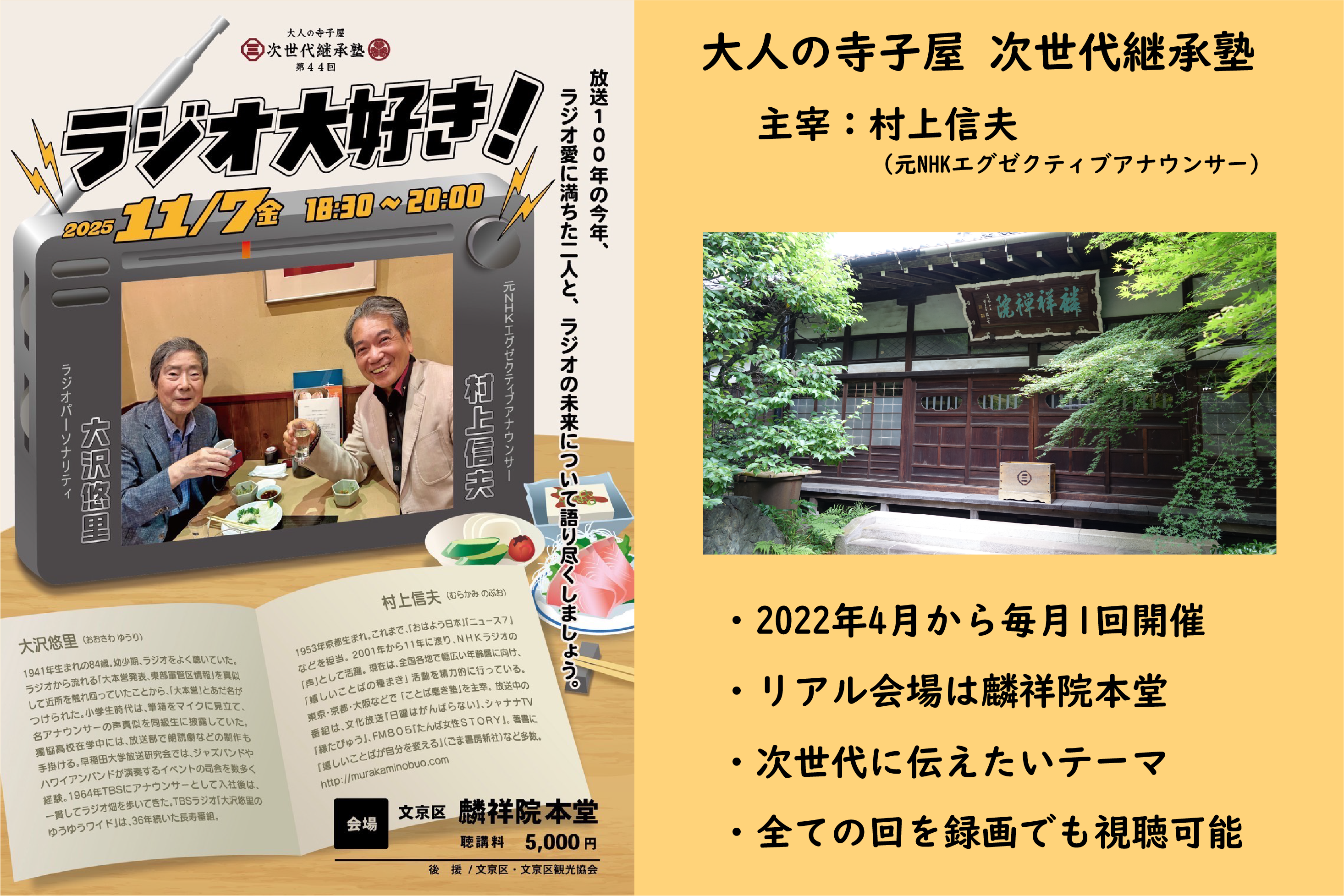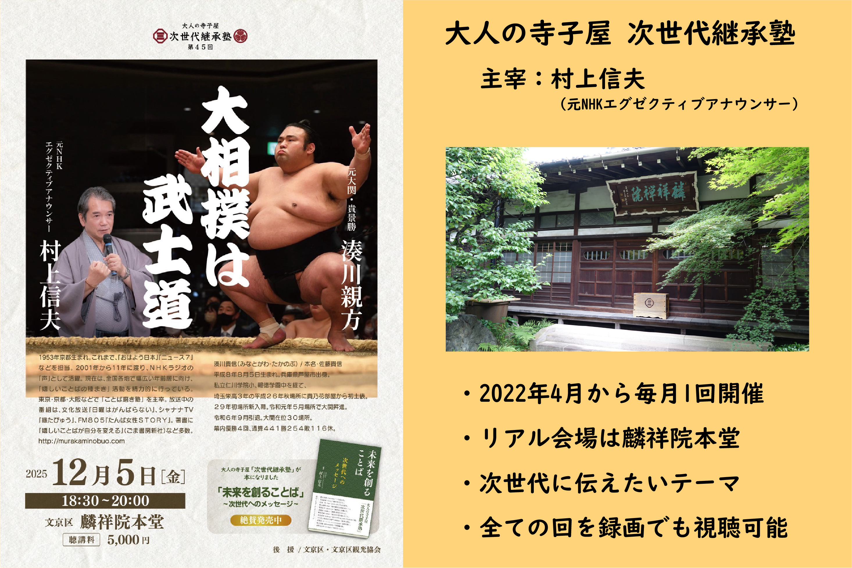 2022年4月から、毎月第1金曜日夕刻より麟祥院本堂(東京都文京区)で開催の対談イベントです。主宰は元NHKエグゼクティブアナウンサー村上信夫。毎月多彩なゲストをお招きし、次の世代に伝えたいことをテーマに語り合う90分。参加はリアル聴講、あるいは対談当日の模様をほぼノーカットで編集したアーカイブ聴講にて。過去の対談もすべてお申込みいただければ視聴できます。詳しくは公式ウェブページをご覧ください。